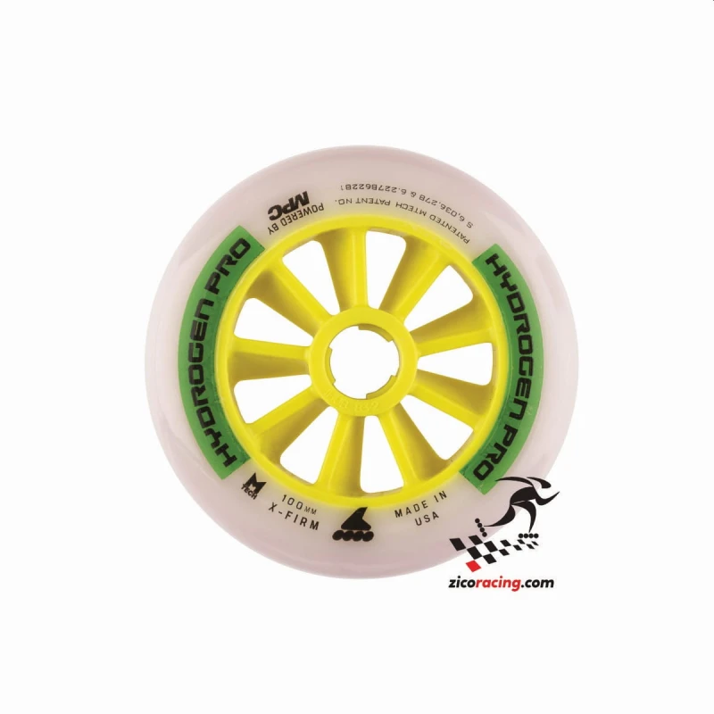 Kółka do jazdy szybkiej MPC Hydrogen Pro 100mm X-Firm, produkowane dla marki Rollerblade. 8 sztuk. Przeznaczone na wyścigi uliczne, ciasne zakręty, szczególnie na suche, gładkie nawierzchnie. Bardzo niskie opory toczenia tych kół zapewniają uzyskanie wysokiej prędkości. Kółka wyprodukowane w USA.