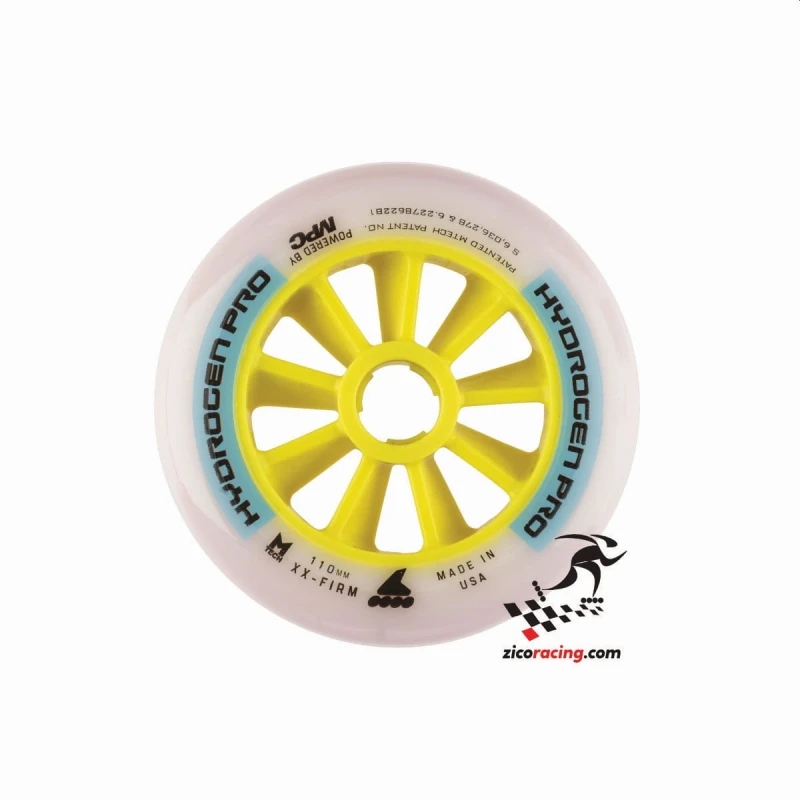 Kółka do jazdy szybkiej MPC Hydrogen Pro 100mm XX-Firm, produkowane dla marki Rollerblade. 6 sztuk. Przeznaczone na wyścigi uliczne, ciasne zakręty, szczególnie na suche, gładkie nawierzchnie. Bardzo niskie opory toczenia tych kół zapewniają uzyskanie wysokiej prędkości. Kółka wyprodukowane w USA.