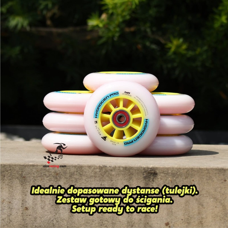 Kółka do jazdy szybkiej MPC Hydrogen Pro 90mm XX-Firm, produkowane dla marki Rollerblade + łożyska Bones Reds + dopasowane tulejki. Przeznaczone na wyścigi uliczne, torowe, ciasne zakręty, szczególnie na suche, gładkie nawierzchnie. Również polecane dla osób, które jeżdżą fitness czy nawet po mieście. Bardzo niskie opory toczenia oraz wysoki rebound tych kół umożliwiają uzyskanie wysokich prędkości.