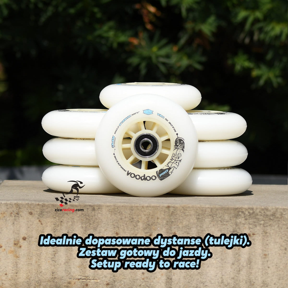 Kółka MPC Junk VooDoo PRO SINGLE 90mm XX-Firm + łożyska Bones Super Reds + dopasowane tulejki. Przeznaczone przede wszystkim do jazdy po mieście, Wizard Skating, ale również nadadzą się do jazdy fitness czy nawet na wyścigi uliczne, ciasne zakręty, szczególnie na suche, gładkie nawierzchnie. Bardzo niskie opory toczenia tych kół zapewniają uzyskanie wysokiej prędkości. Kółka są też bardzo trwałe.