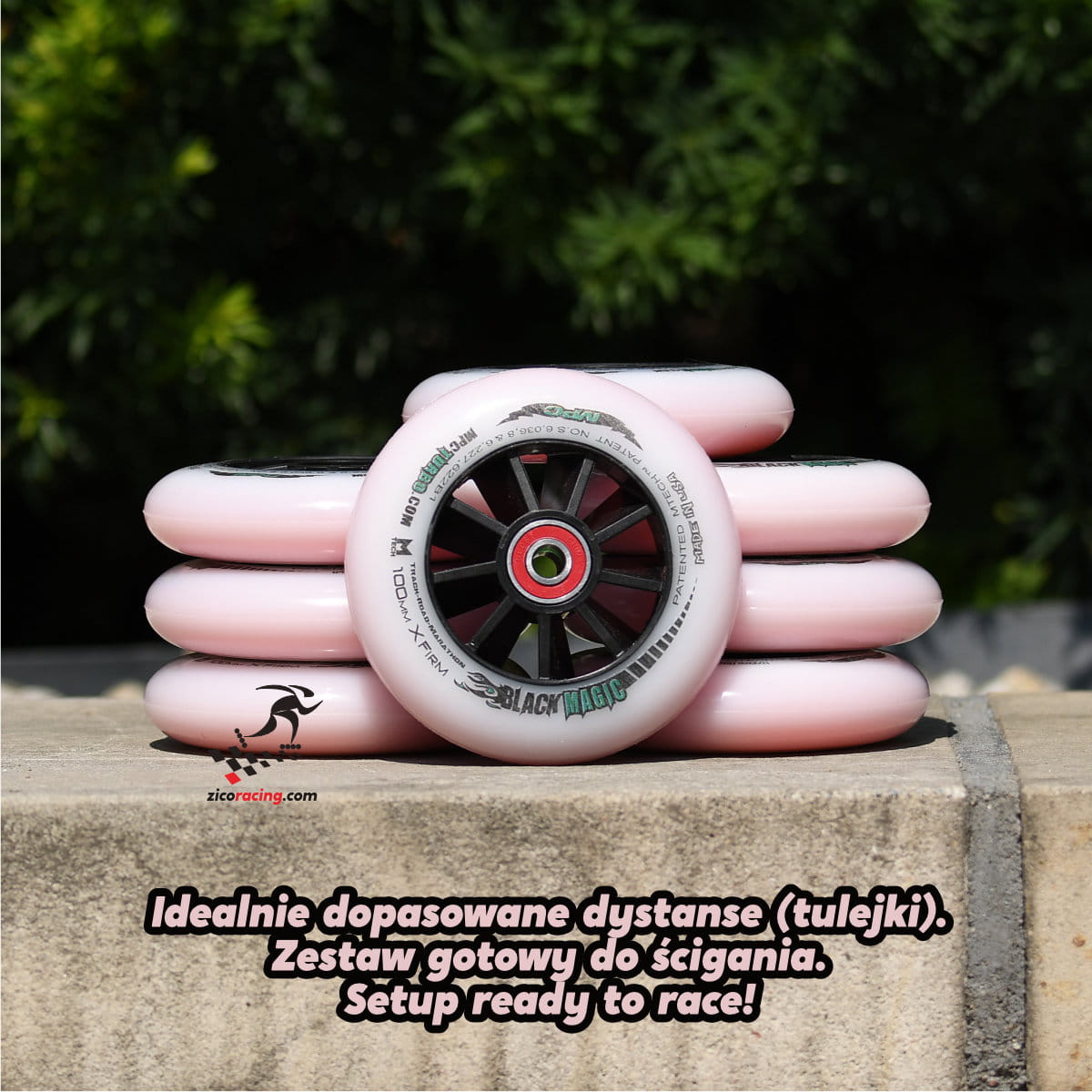 Kółka do jazdy szybkiej MPC Black Magic X-Firm 100mm + łożyska Bones Reds + dopasowane tulejki. Przeznaczone na wyścigi uliczne, szczególnie na suche, gładkie nawierzchnie. Niskie opory toczenia tych kół zapewniają dużą prędkość.