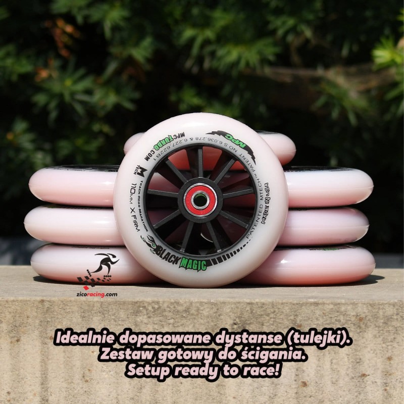 Kółka do jazdy szybkiej MPC Black Magic X-Firm 110mm + łożyska Bones Reds + dopasowane tulejki. Przeznaczone na wyścigi uliczne, szczególnie na suche, gładkie nawierzchnie. Niskie opory toczenia tych kół zapewniają dużą prędkość.