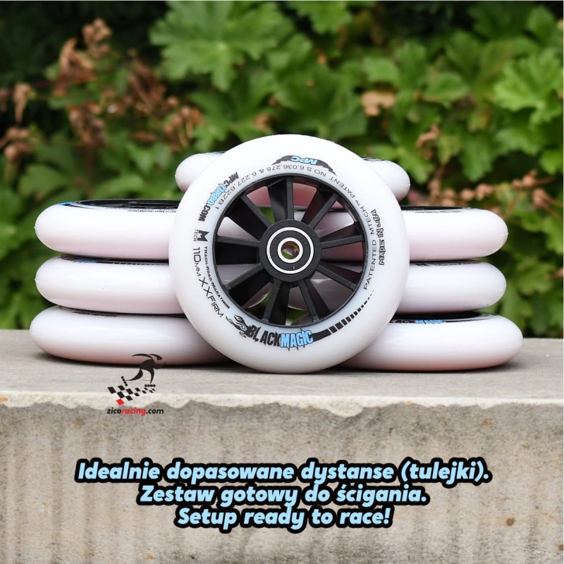 Kółka do jazdy szybkiej MPC Black Magic XX-Firm 110mm + łożyska Bones Super Reds + dopasowane tulejki. Przeznaczone na wyścigi uliczne, szczególnie na suche, gładkie nawierzchnie. Niskie opory toczenia tych kół zapewniają dużą prędkość.
