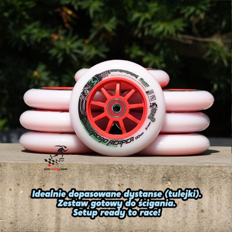 Kółka do jazdy szybkiej MPC Junk Road Reaper 110mm X-Firm + łożyska Bones Reds + dopasowane tulejki. Przeznaczone na wyścigi uliczne, szczególnie na suche, gładkie nawierzchnie. Bardzo dobre kółka na sprinty. Bardzo niskie opory toczenia tych kół zapewniają uzyskanie wysokiej prędkości.