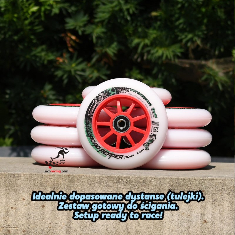 Kółka do jazdy szybkiej MPC Junk Road Reaper 110mm X-Firm + łożyska Bones Super Reds + dopasowane tulejki. Przeznaczone na wyścigi uliczne, szczególnie na suche, gładkie nawierzchnie. Bardzo dobre kółka na sprinty. Bardzo niskie opory toczenia tych kół zapewniają uzyskanie wysokiej prędkości.