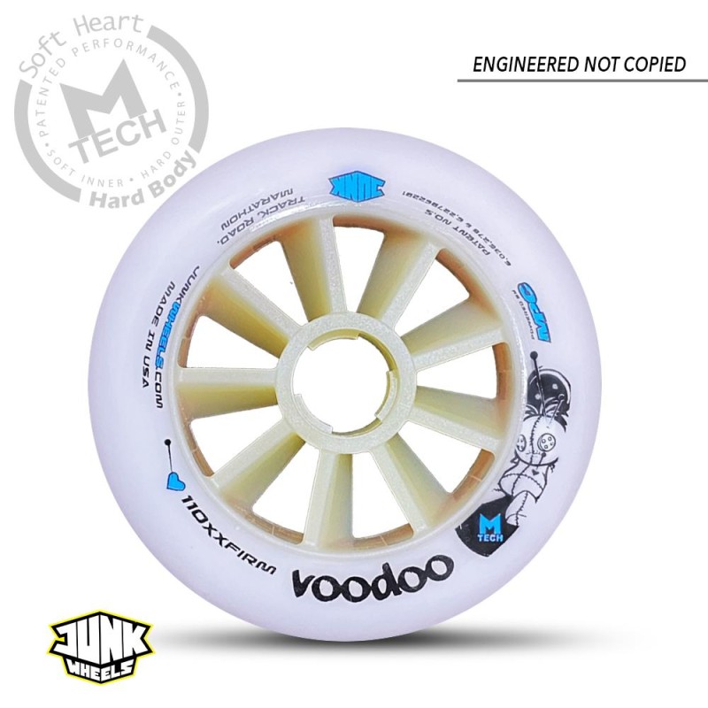 Kółka do jazdy szybkiej MPC Junk VooDoo 110mm X-Firm. Przeznaczone na wyścigi uliczne, ciasne zakręty, szczególnie na suche, gładkie nawierzchnie. Bardzo niskie opory toczenia tych kół zapewniają uzyskanie wysokiej prędkości. Technologia double layer - podwójna twardość opony. Twarda, zewnętrzna powłoka zapewnia niskie opory toczenia (dużą prędkość); a miękka, wewnętrzna odpowiada za trzymanie na łukach oraz odbicie.
