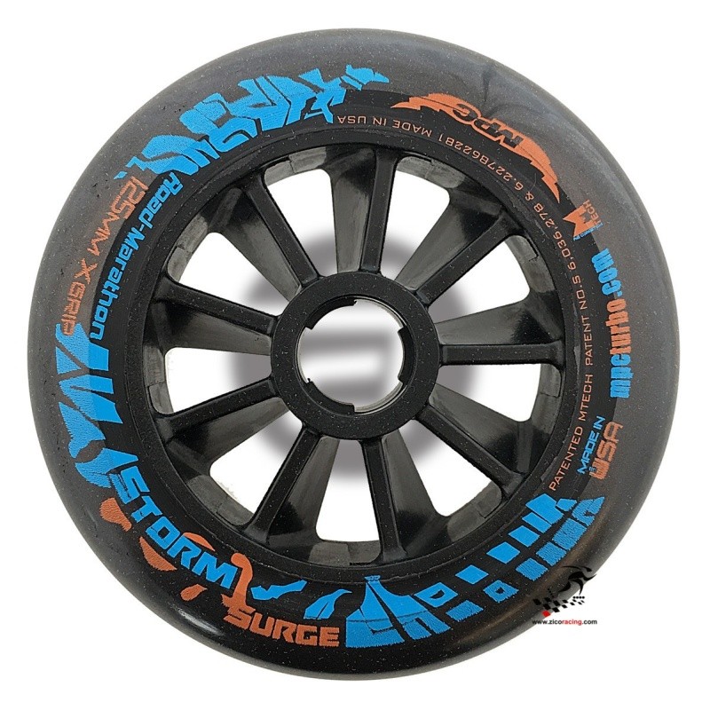 Kółka do jazdy szybkiej na mokre nawierzchnie MPC Storm Surge Turbo X Grip 125mm - 6 sztuk. Kółka przeznaczone tylko i wyłącznie na deszcz oraz mokre nawierzchnie. Najlepsza przyczepność spośród wszystkich kół na rynku podczas jazdy w ulewie czy na bardzo mokrych nawierzchniach. Twardość 85a/86a powłoka zewnętrzna oraz 60a powłoka wewnętrzna (Multi Layer Technology). Zalecamy korzystanie z tych kół tylko i wyłącznie podczas ulewy lub jeśli cała nawierzchnia trasy jest mokra. Stosować podczas wyścigów ulicznych.