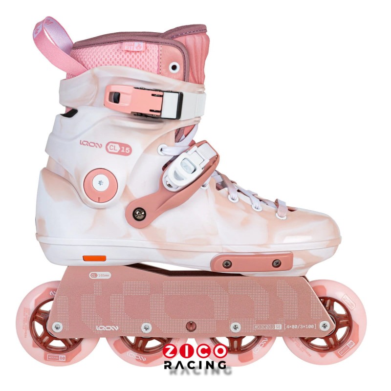 Rolki IQON CL15. Idealne dla osób początkujących czy już jeżdżących, chcących uprawiać Wizard Skating czy nawet szybko przemieszczać się po mieście. But wiązany z dwiema klamrami. Klamra 45 stopni z mikro regulacją (pompka). Górna wsuwana i zamykana standardowo. Regulacja pochylenia cholewki na boki, każdy w 4 zakresach, co daje 16 możliwości. Buty posiadają montaż szyn w standardzie SSM 165mm, jest pełna regulacja szyny wzdłużnie (aluminiowy monoblok z przesuwaną nakrętką) oraz poprzecznie (szyny z poprzecznymi otworami). But wewnętrzny MyFit Second Skin, termoformowalny w temperaturze 80°C, wyciągany, dodatkowo usztywniony w górnej części mankietu. But wewnętrzny posiada amortyzator (gąbkę) pod piętą. Dodatkowy amortyzator w bucie rolek, również pod piętą. Szyny z aluminium lotniczego 7003 na montaż 165mm o długości 260mm. Szyny w wersji 4 na kółka 80mm posiadają 1mm rockering oraz mają możliwość założenia 3 kółek o maksymalnej średnicy 100mm. Szyny posiadają 4 kółka Access 80mm / 85a, profil eliptyczny, łożyska serwisowe, rozbieralne Wicked Abec 9, 7 kuleczkowe z koszykiem nylonowym, osłonięte uszczelką RS z jednej strony. Rozmiary podwójne.
