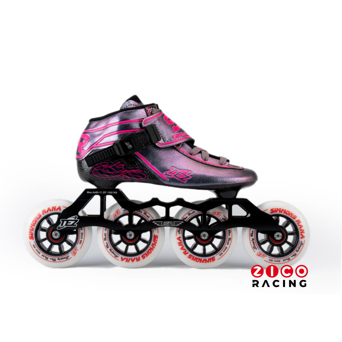Rolki Simmons Rana Racing TEZ - zestaw do wrotkarstwa szybkiego. Buty wykonane z bardzo sztywnego oraz ultralekkiego włókna węglowego (około 55%). Buty zalecane dla osób, które chcą zacząć swoją przygodę z wrotkarstwem szybkim (jazdą szybką na rolkach) lub przesiąść się na porządne buty do ścigania oraz posiadać jedne z najszybszych butów na świecie (z najwyższym transferem siły odepchnięcia). Są też świetnym wyborem dla dzieci oraz młodzieży, które potrzebują dopasowanych butów do prawidłowego nabycia techniki jazdy i rozwoju w ściganiu. Dodatkowo są to jedne z najlżejszych butów na świecie - większość producentów produkuje buty w wagach około i powyżej 500 gram. Rush waży 358 gram w rozmiarze US 8 czyli około 253mm/39-40 EU. Różnica na wadze jednego buta to ponad 140 gramów.