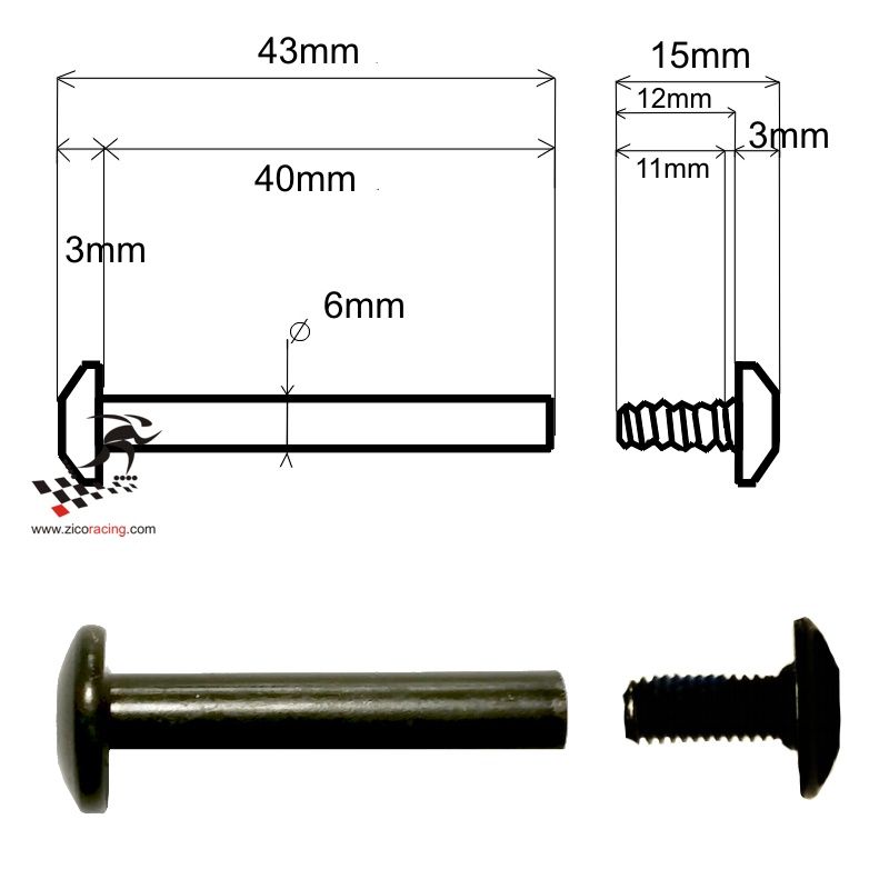 Śruba / ośka z nakrętką do rolek Rollerblade lub innych z tulejkami wkładanymi w pierścienie wewnętrzne łożysk. Zestaw zawiera ośkę o średnicy 6mm oraz śrubę wkręcaną. Długość ośki 43mm, długość całej śruby 46mm do ponad 50mm w zależności od wkręconej śruby.