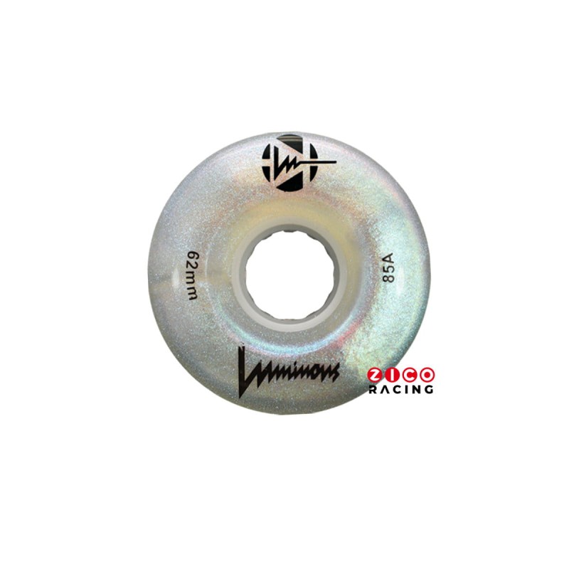 Świecące kółka do wrotek Luminous Biały Brokat 62mm 85a. Przeznaczone do jazdy rekreacyjnej. Świecą jasnym światłem ledowym. 4 sztuki z tulejkami w komplecie.