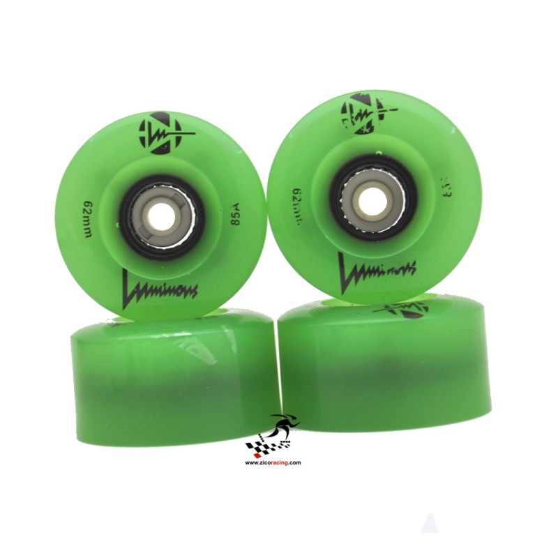 Świecąco - fluorescencyjne kółka do wrotek Luminous Green Glow 62mm 85a. Przeznaczone do jazdy rekreacyjnej. Świecą jasnym światłem ledowym. 4 sztuki z tulejkami w komplecie.