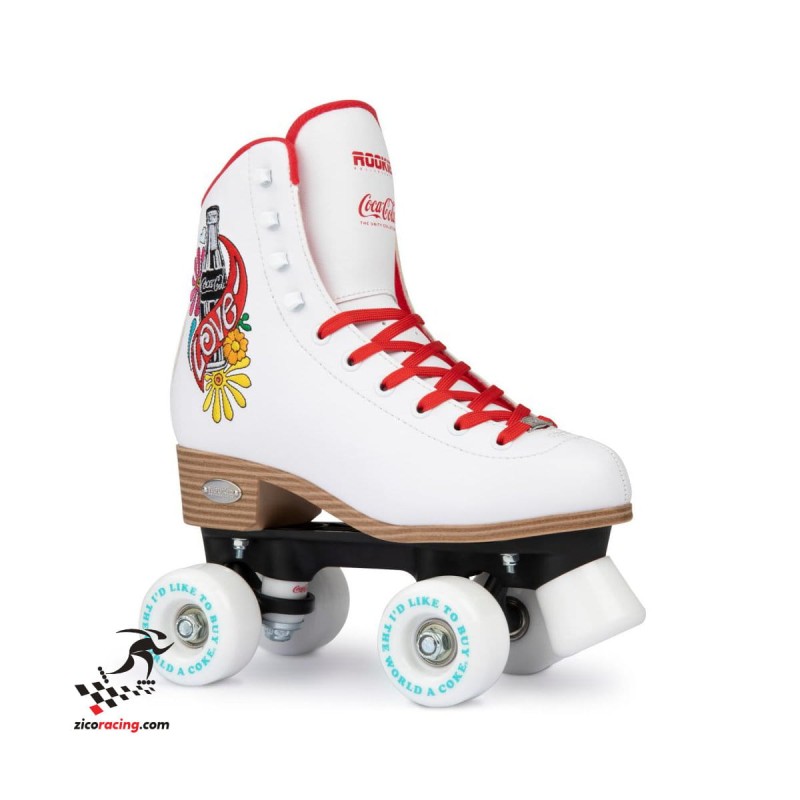 Wrotki Rookie Coca Cola. Wrotki do jazdy rekreacyjnej dla lekkich osób. Wegańskie, wykonane z mocnego winylu, marki Rookie Rollerskates przy współpracy z firmą Coca Cola. Kółka o średnicy 58mm, twardości 80a, łożyska nierozbieralne ABEC 7. Plate wykonany z mocnego nylonu, nieregulowany hamulec / stoper.