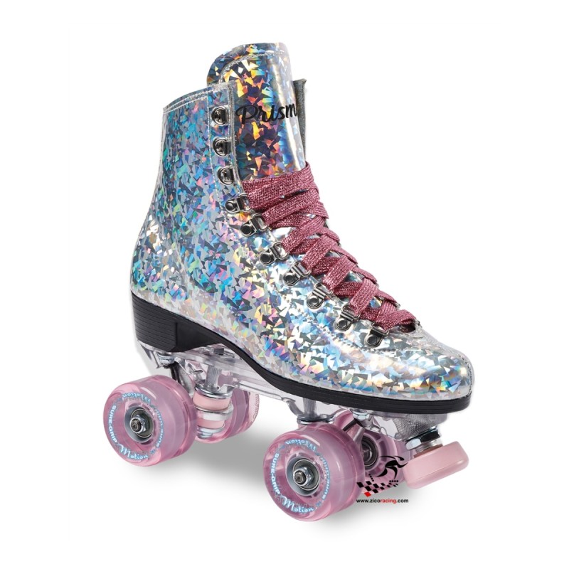 Wrotki Sure Grip model Prism Pink. Wrotki dla początkujących i zaawansowanych, do jazdy rekreacyjnej po mieście czy nawet na wrotkarniach. But jest wykonany wewnątrz ze skóry (producent podaje vegan), zewnętrznie z winylu. Sznurowanie jest oparte na metalowych zaczepach. Plate jest wykonany z mocnego nylonu. Kółka o średnicy 62mm, szerokości 32mm i twardości zmierzonej 80a. Łożyska rozbieralne z koszykiem nylonowym, osłonięte szczelnie osłonką gumowo - metalową. W zestawie para wrotek.