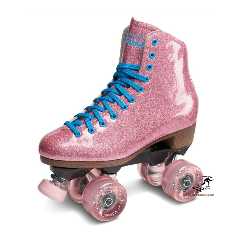 Wrotki Sure Grip model Stardust Glitter Pink. Wrotki dla początkujących i zaawansowanych, do jazdy rekreacyjnej po mieście czy nawet na wrotkarniach. But jest wykonany wewnątrz ze skóry (producent podaje vegan), zewnętrznie z winylu. Sznurowanie jest oparte na metalowych zaczepach. Plate jest wykonany z mocnego nylonu. Kółka o średnicy 62mm, szerokości 32mm i twardości zmierzonej 80a. Łożyska rozbieralne z koszykiem nylonowym, osłonięte szczelnie osłonką gumowo - metalową. W zestawie para wrotek.